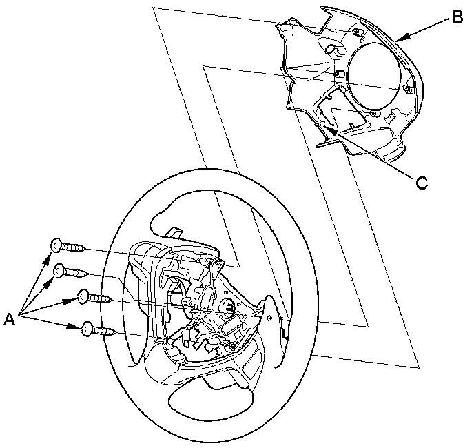2. Remove the four screws (A) securing the steering wheel rear cover (B).