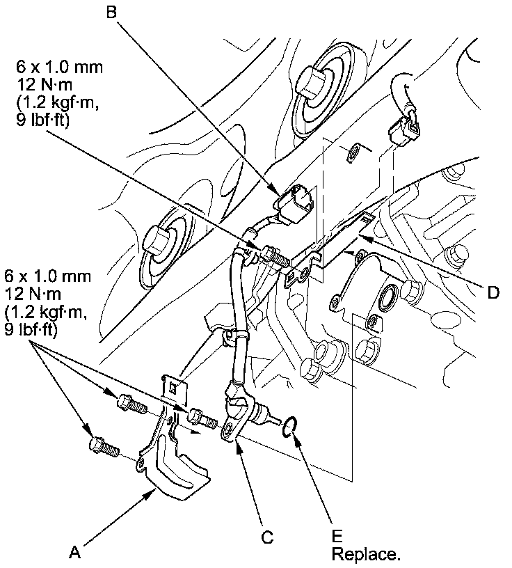 4. Install the rear differential fluid temperature sensor with a new O-ring (E) in the reverse order of removal.