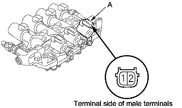 13. Measure the resistance of line pressure solenoid valve A between connector terminals No. 1 and No. 2.