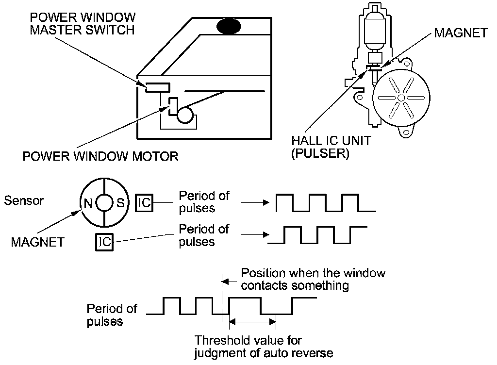 The driver's and front passenger's power window motors incorporate a Hall IC unit (pulser) which generates pulses during the motor's operation and sends pulses to the driver's and passenger's power window control units. As soon as the power window control units detect a change in the pulse frequency from the Hall IC unit (pulser), the power window control units make the power window motor stop and reverse. This prevents pinching your hand or fingers during auto-up operation. The auto reverse function does not work when the power window master switch is held in the closed position.