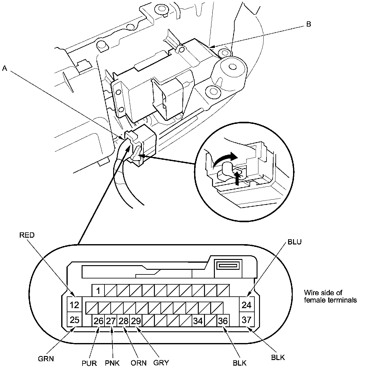 2. Disconnect the front passenger's power window switch 37P connector (A) from the front passenger's power window switch (B).