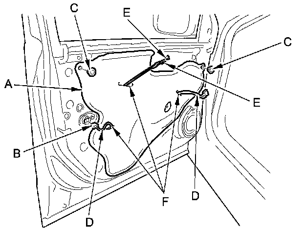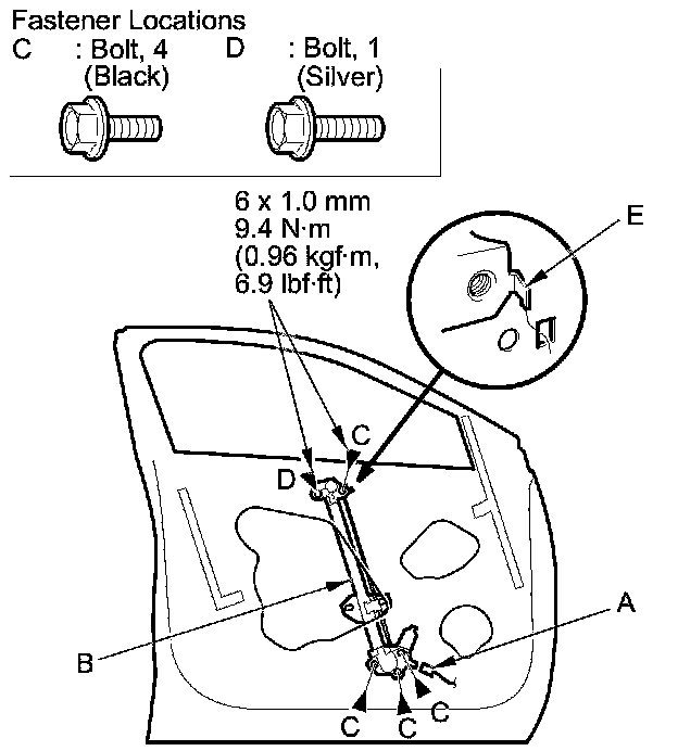 6. Remove the bolts (C), and loosen the bolt (D). Release the hook (E), then remove the regulator through the hole in the door.