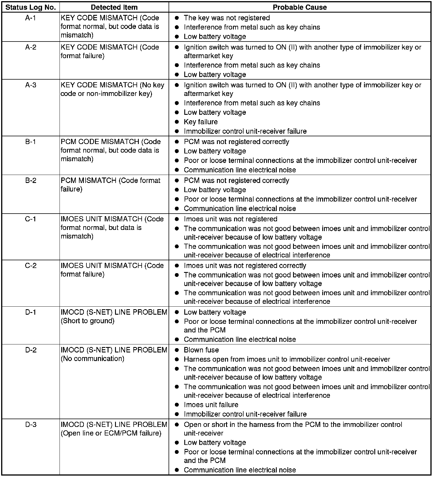 Immobilizer System Status Log