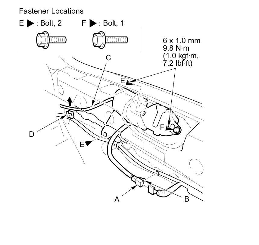 5. Remove the bolts (E), and loosen the bolt (F).