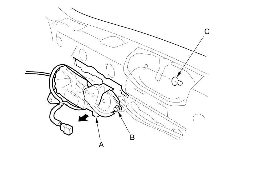 6. Pull the trunk lid latch (A) away to release the bolt (B) from the hole (C) in the body, then remove the latch.