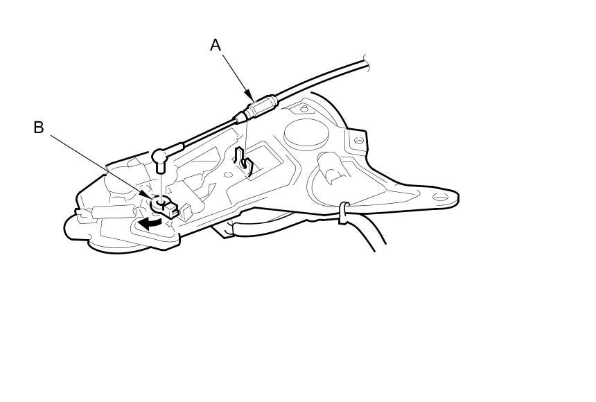 7. Disconnect the trunk lid opener cable (A) from the cable fastener (B).