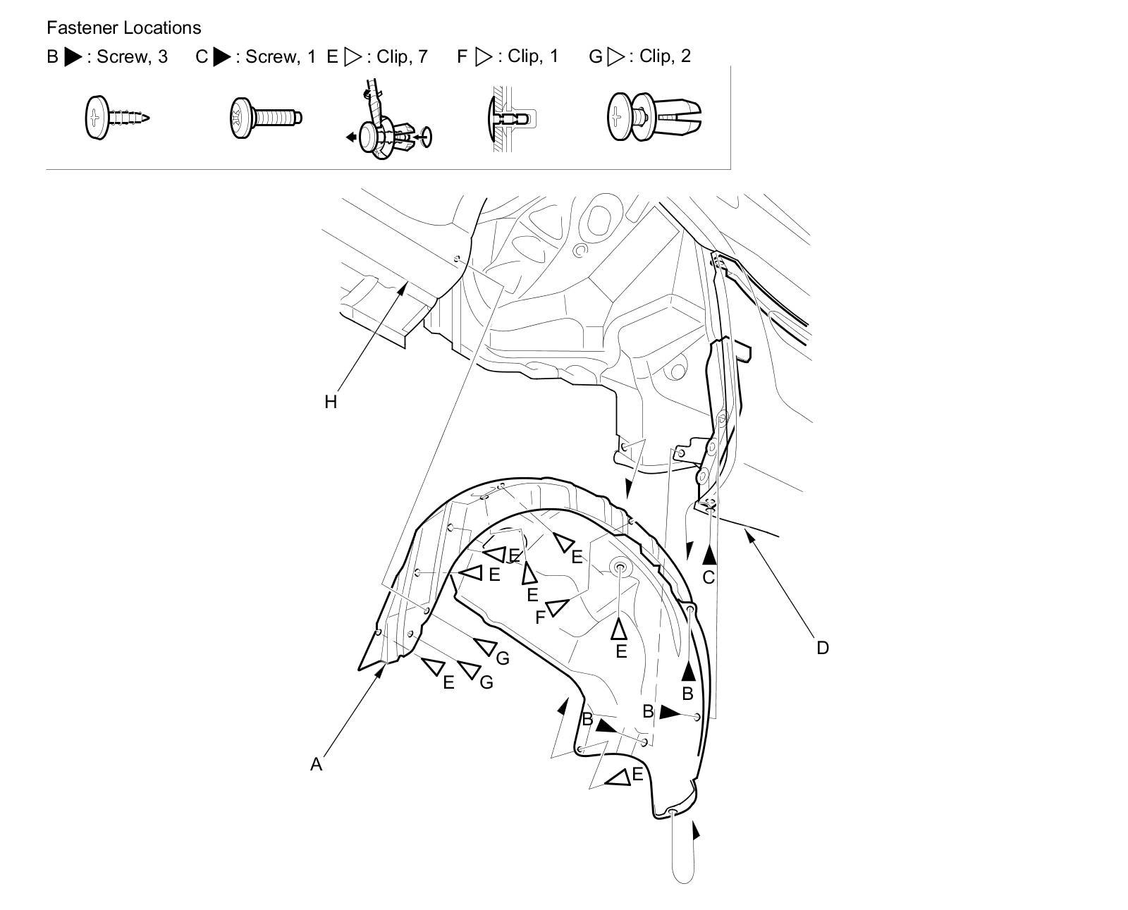 3. Remove the clips (G) securing the side sill panel (H) and the rear inner fender on the front of the rear wheel arch.