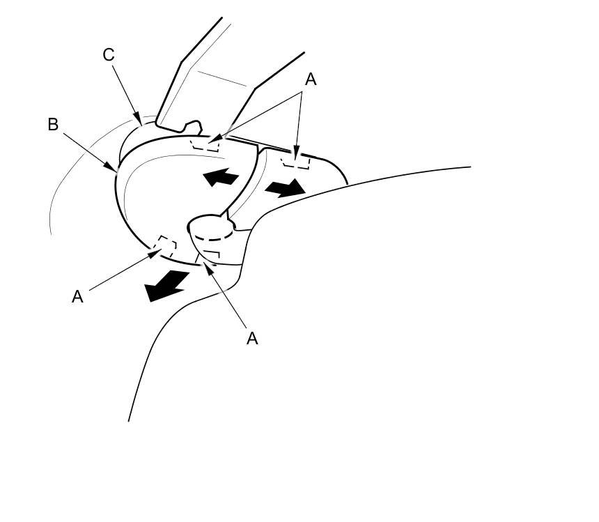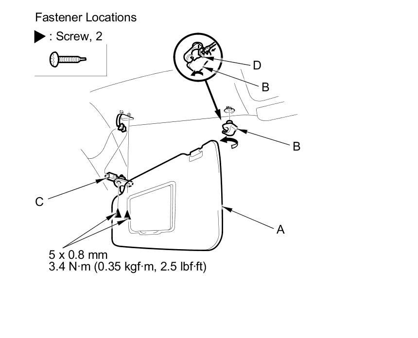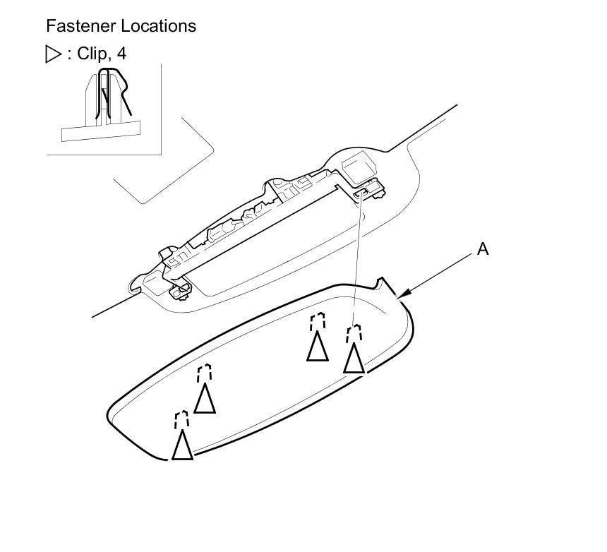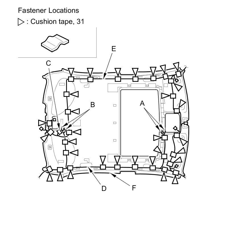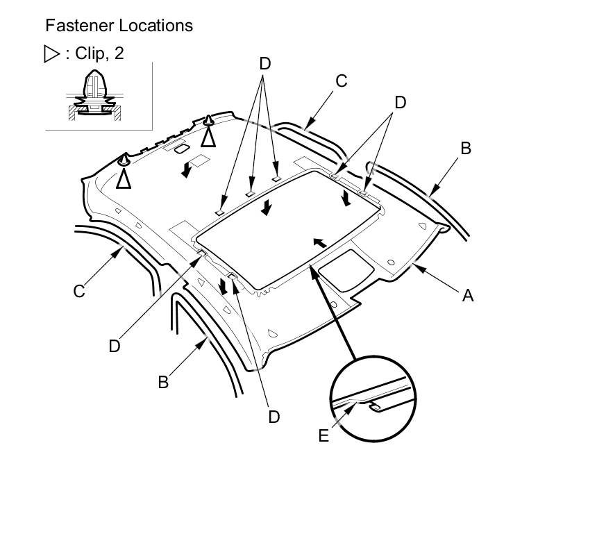 - Any fastener (B) or clip base (C) which have come off the headliner
