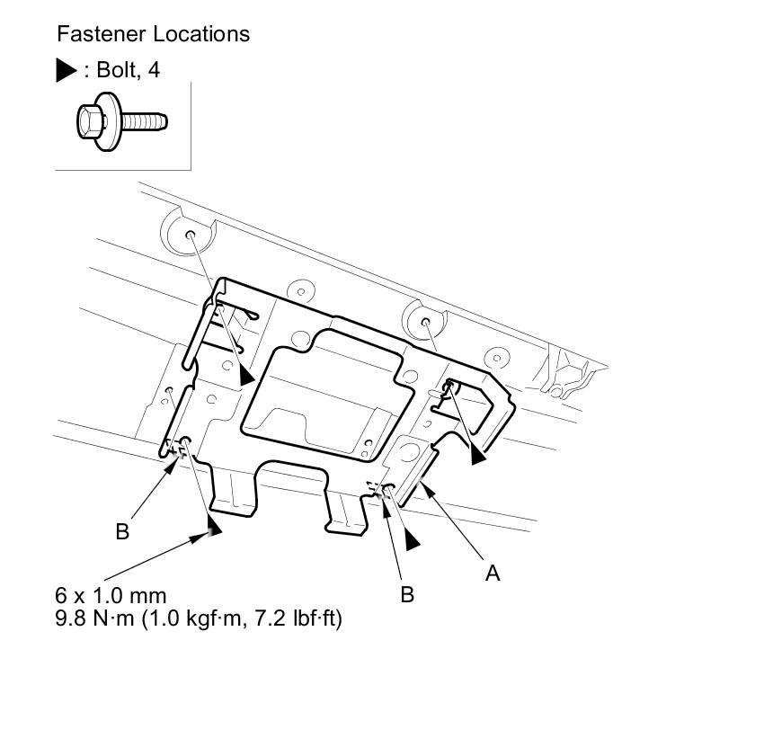 10. If necessary, remove the bolts, then remove the roof console bracket (A) by releasing two hooks (B).