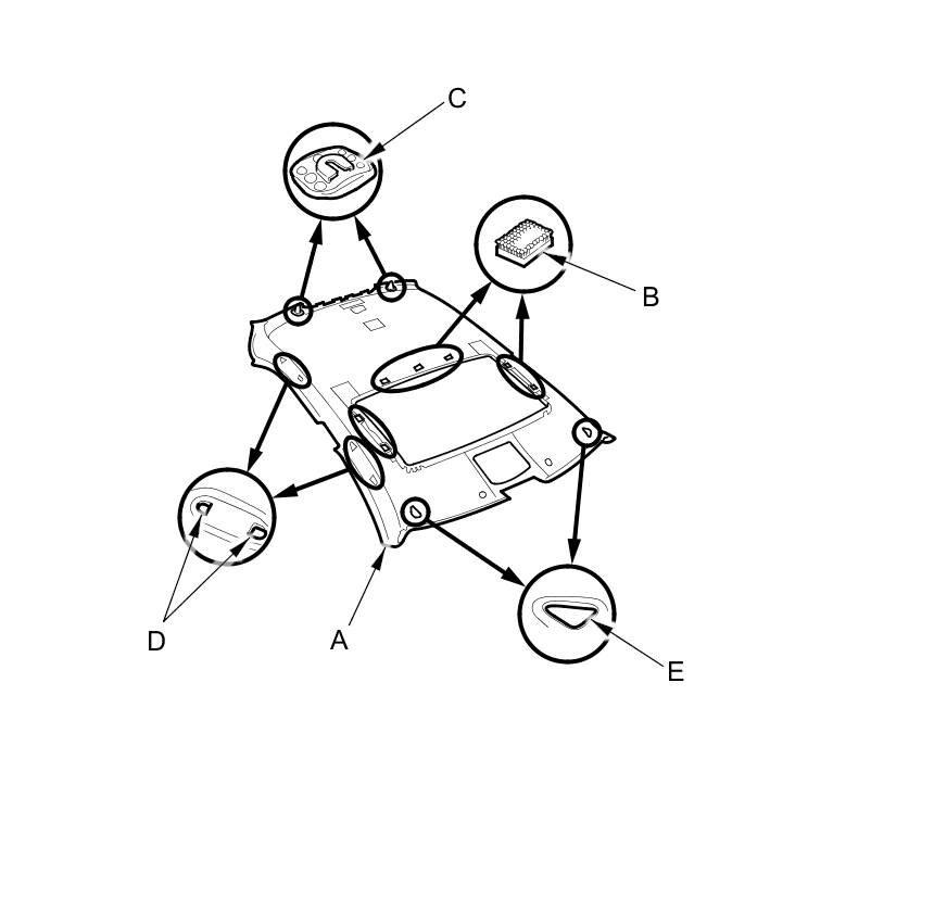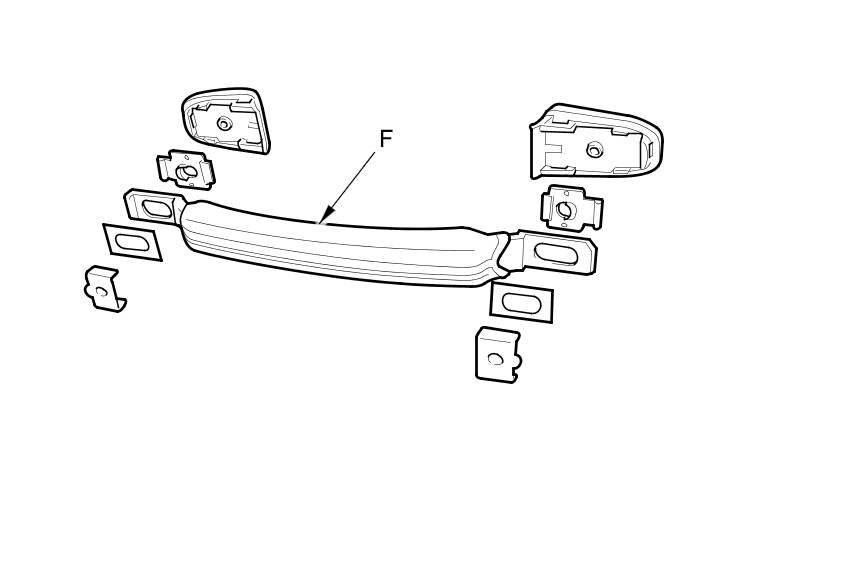 - Any damage around the grab handle holes (D) or the sunvisor holes (E) in the headliner