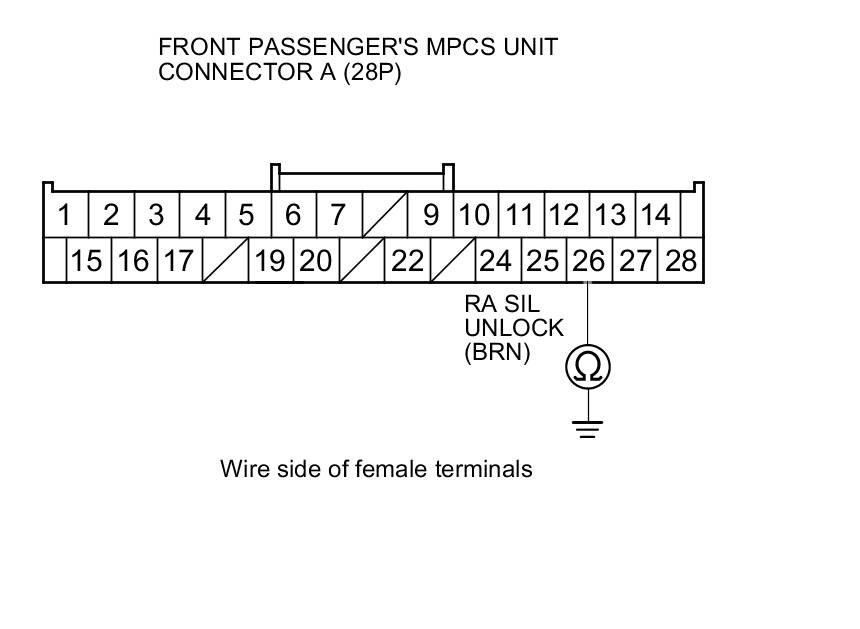 7. Check for continuity between front passenger's MPCS unit connector A (28P) terminal No. 26 and body ground.