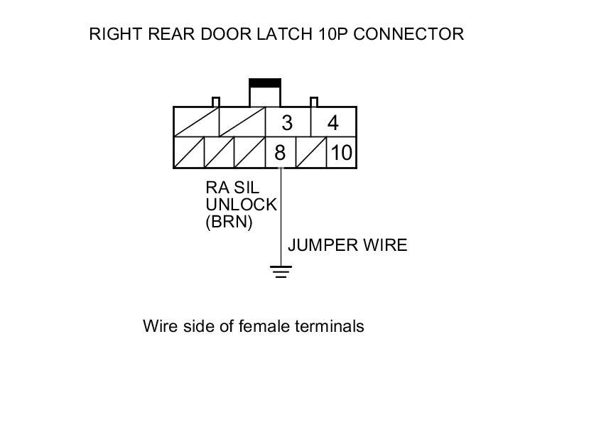 9. Connect right rear door latch 10P connector terminal No. 8 to body ground with a jumper wire.