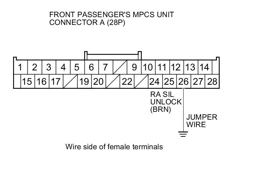 12. Connect front passenger's MPCS unit connector A (28P) terminal No. 26 to body ground with a jumper wire.