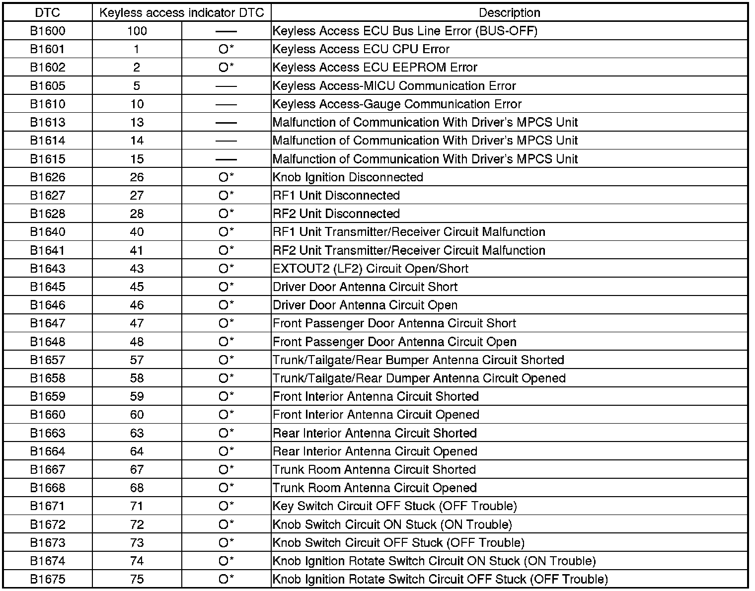 The keyless access system has a self-diagnosis function. If any malfunction is stored in the keyless access control unit, the DTC codes can be determined by the keyless access indicator blinking pattern.