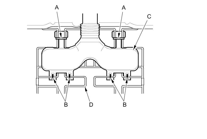 4. Release the wire bands (A) and the clips (B) securing the blower duct (C) to the seat cushion frame springs (D).
