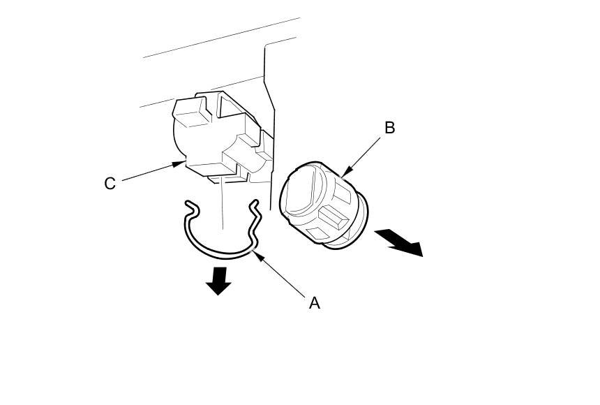 4. Remove the retainer clip (A), then remove the trunk pass-through cover key cylinder (B) from the lid (C).