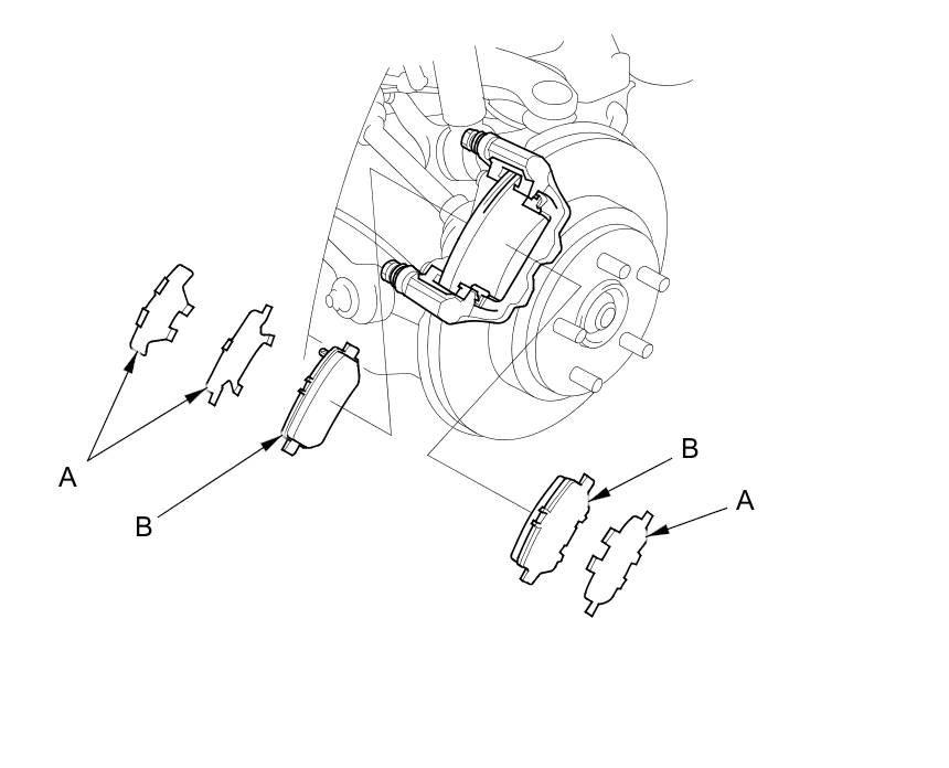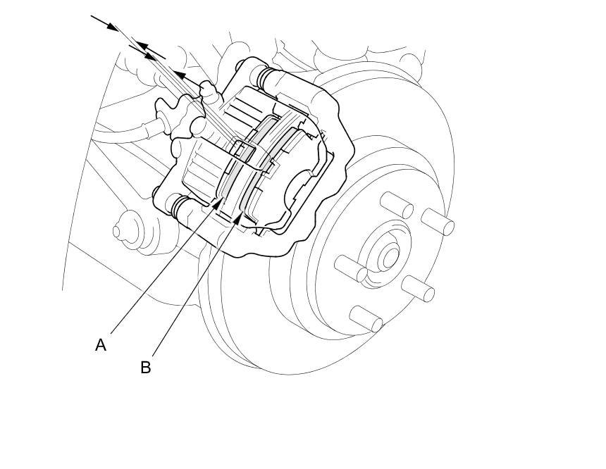 3. Check the thickness of the inner brake pad (A) and outer pad (B). Do not include the thickness of the backing plate.