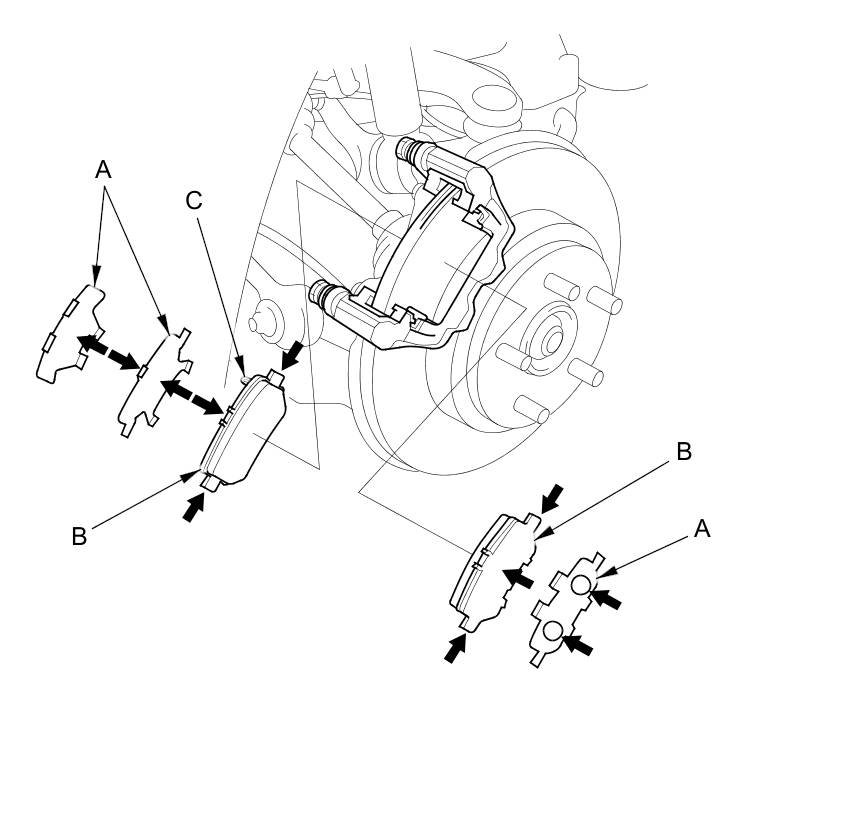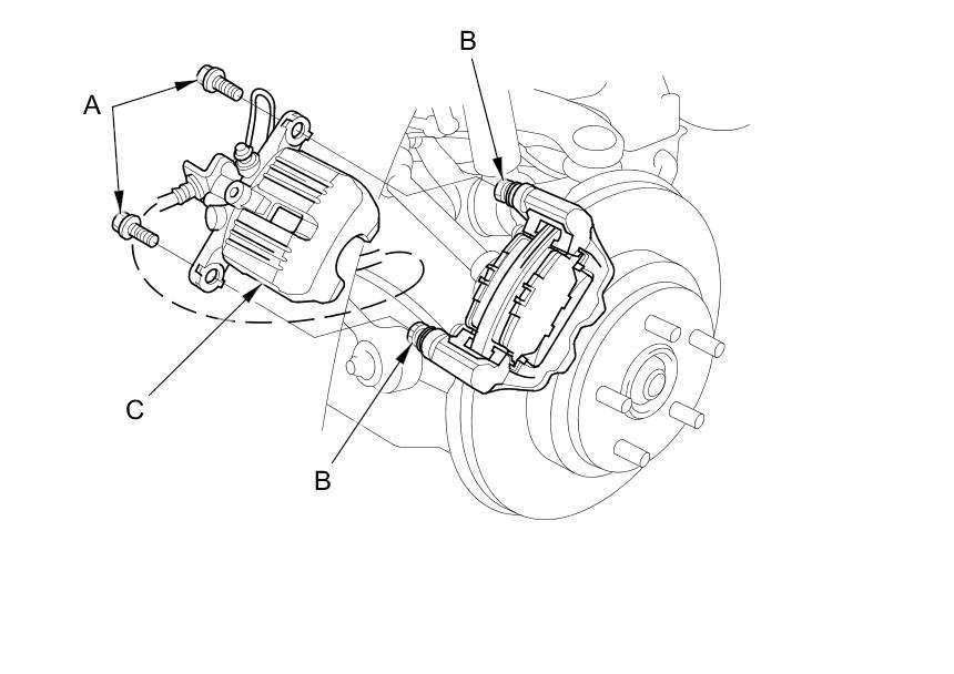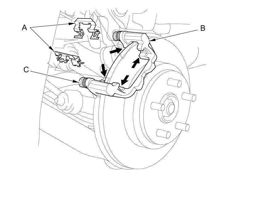 Verify that the caliper pins (C) move in and out smoothly. Clean and lube if needed.