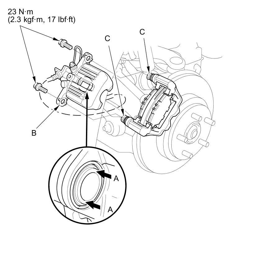 19. Install the caliper bolts, and tighten them to the specified torque while holding the respective caliper pins (C) with a wrench being careful not to damage the pin boot.