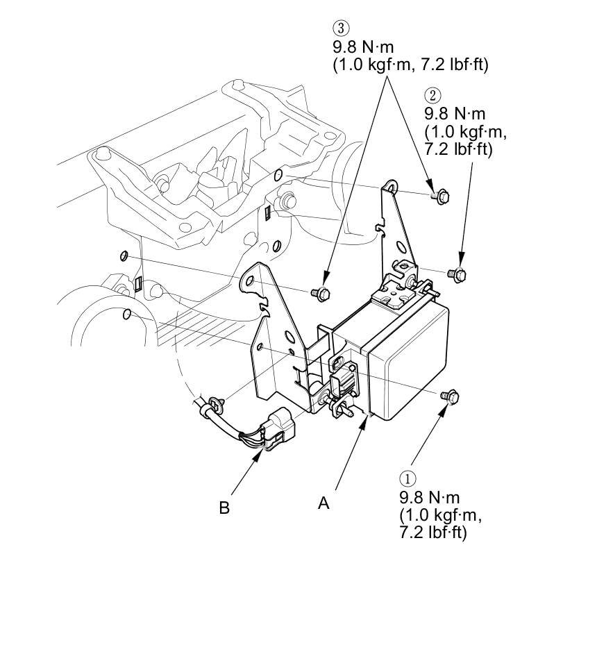 8. Install the millimeter wave radar (A), then tighten the bolts in the numbered sequence shown.
