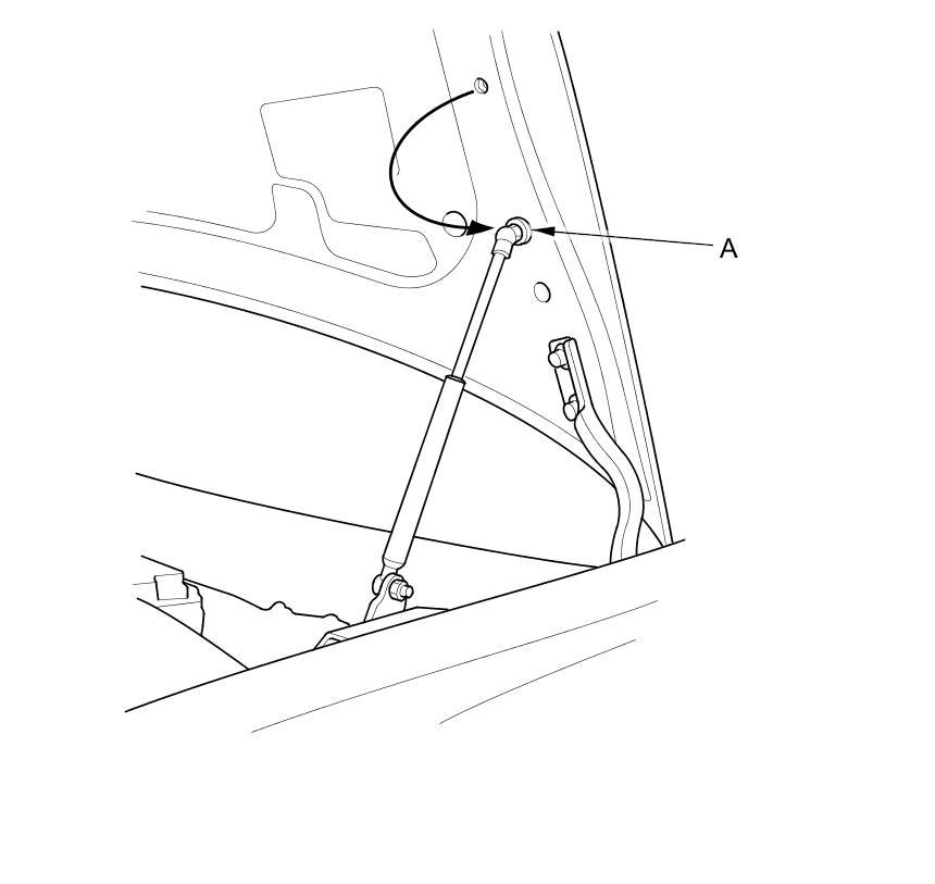 1. Disconnect the support struts from both sides of the pivot ball (bolted to the hood) (A). Secure the hood in a vertical position. Remove the right side pivot ball and install it into the lower threaded hole, then reattach the support strut.