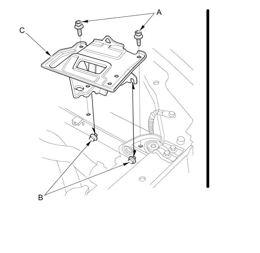 8. Remove the two upper bolts (A), and loosen the two lower bolts (B), then remove the battery base (C).