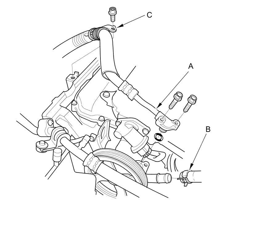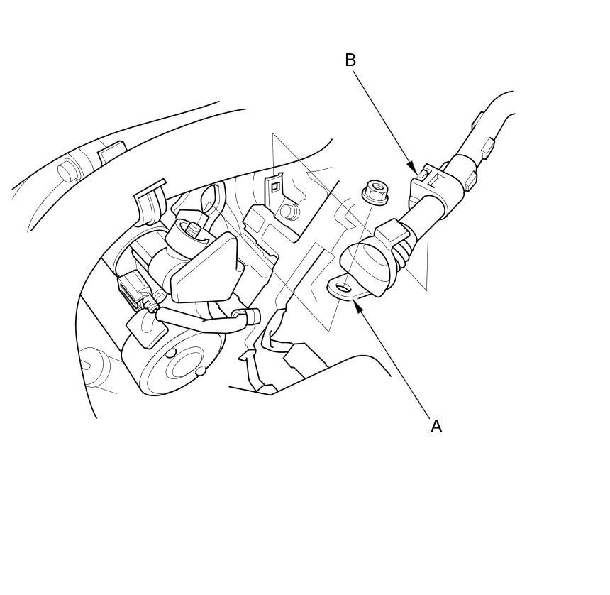19. Disconnect the pump outlet hose (A) and the pump inlet hose (B) from the power steering pump, then plug the hoses and the power steering pump.