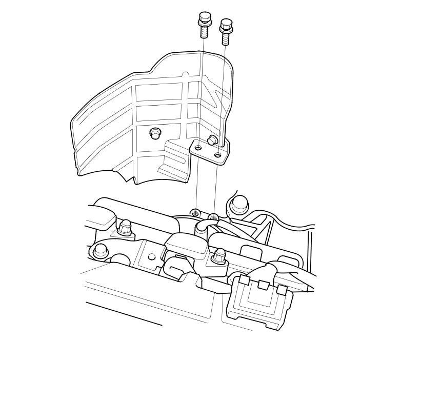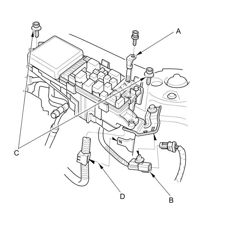 12. Remove the under-hood fuse/relay box mounting bolts (C), and the harness clamp (D).