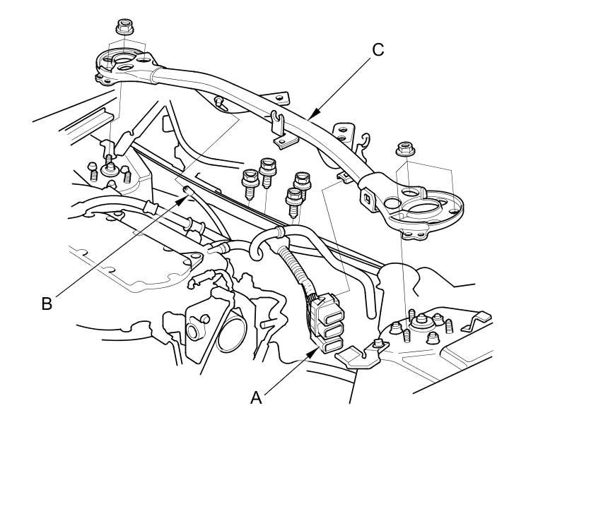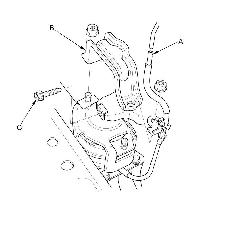 55. Disconnect the vacuum hose (A), then remove the front engine mounting mount stop (B) and the front engine mount bolt (C).