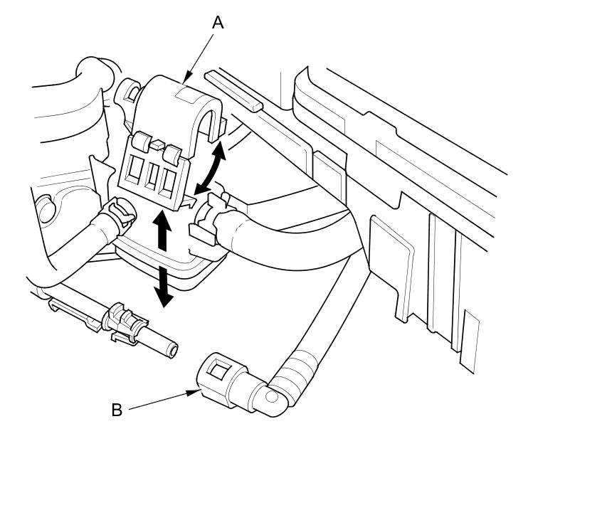 13. Remove the harness clamp (A), and disconnect the engine wire harness connectors (B) on the left side of the engine compartment.