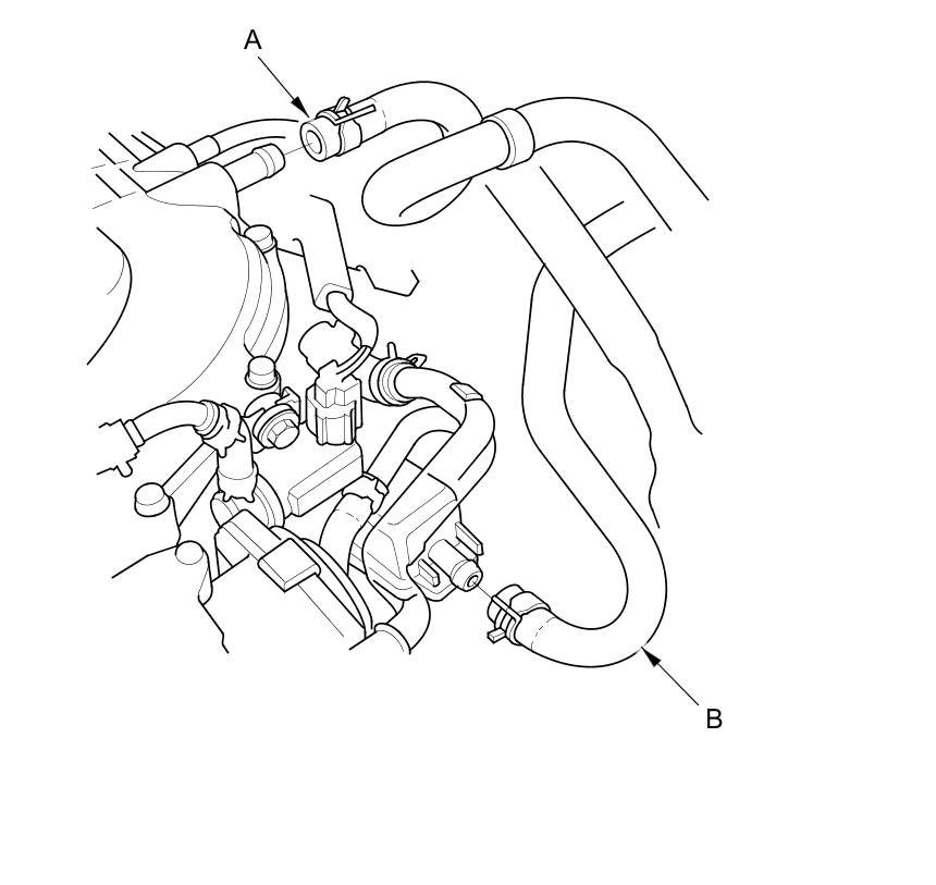 16. Disconnect the brake booster vacuum hose (A) and the EVAP canister hose (B).