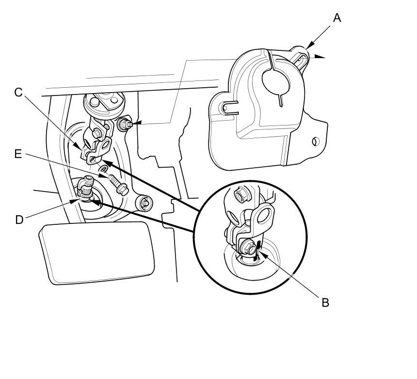 24. Make a reference mark (B) across the steering joint (C) and the steering gearbox pinion shaft (D). Remove the steering joint bolt (E), and disconnect the steering joint from the steering gearbox pinion shaft.