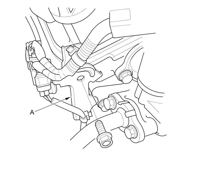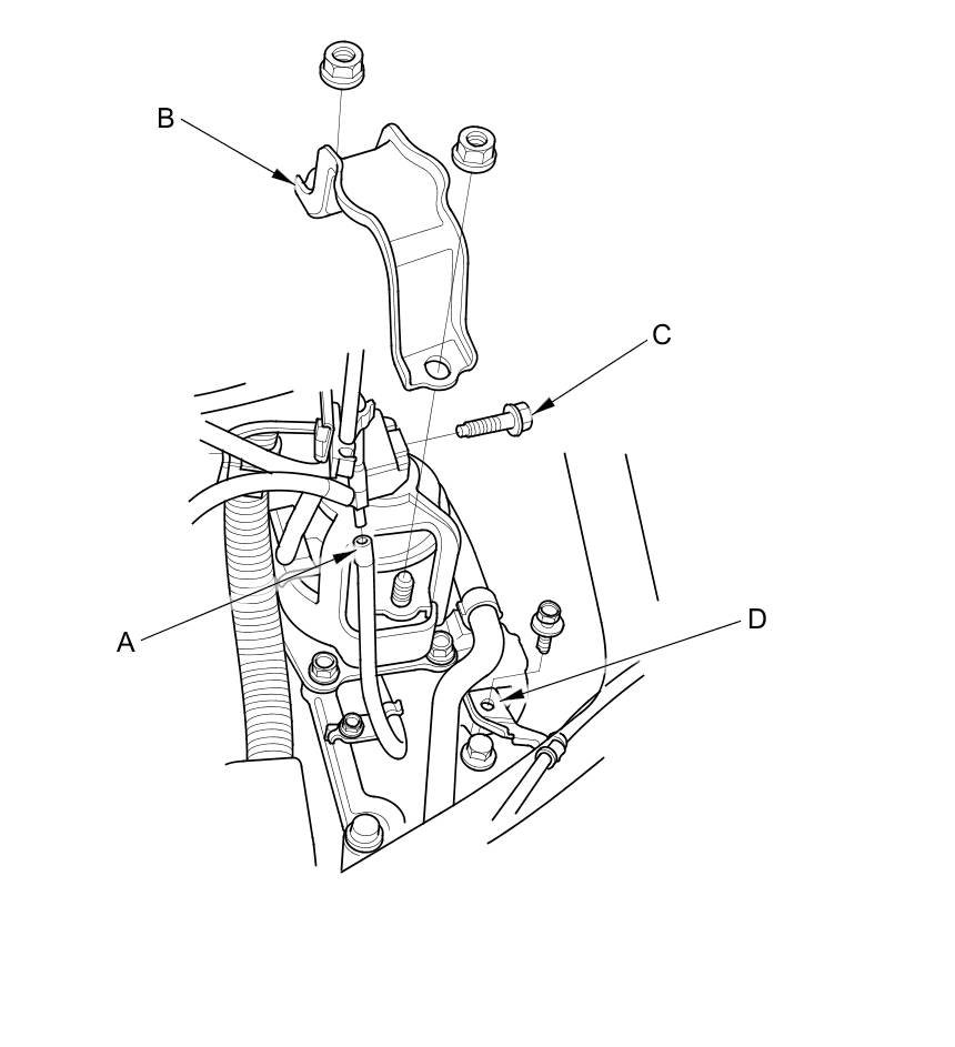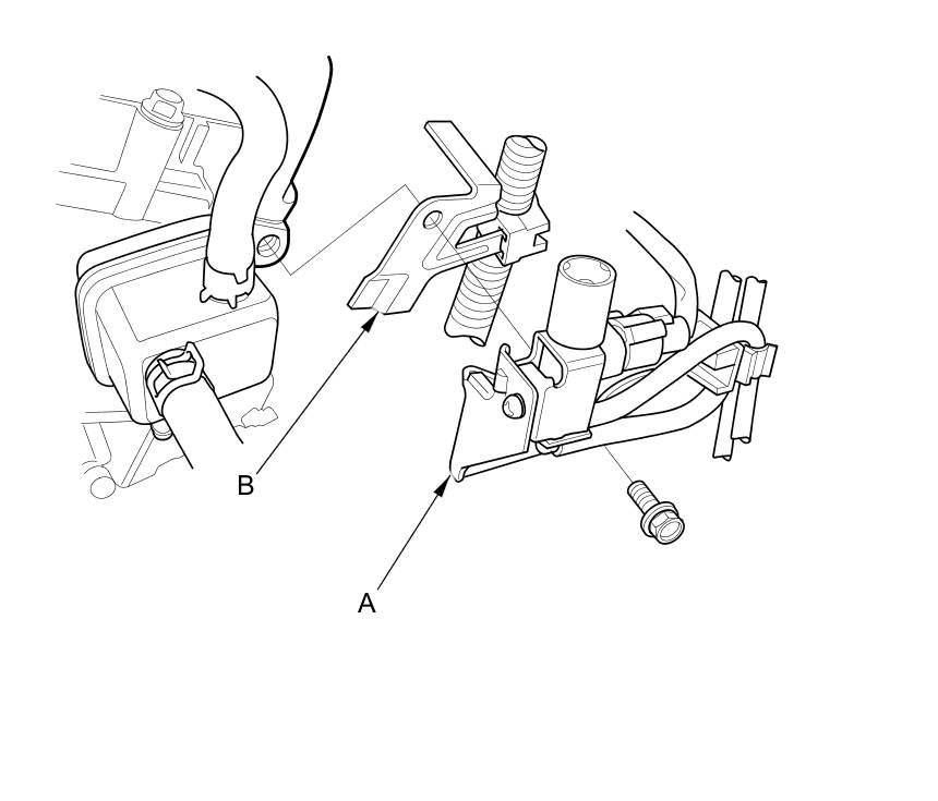 52. Remove the engine mount control solenoid valve bracket (A) and the harness bracket (B) from the rear cylinder head.