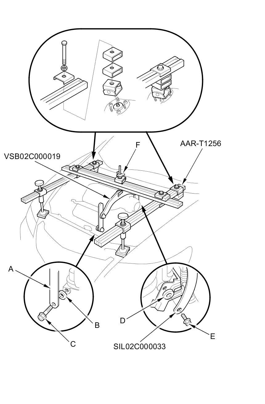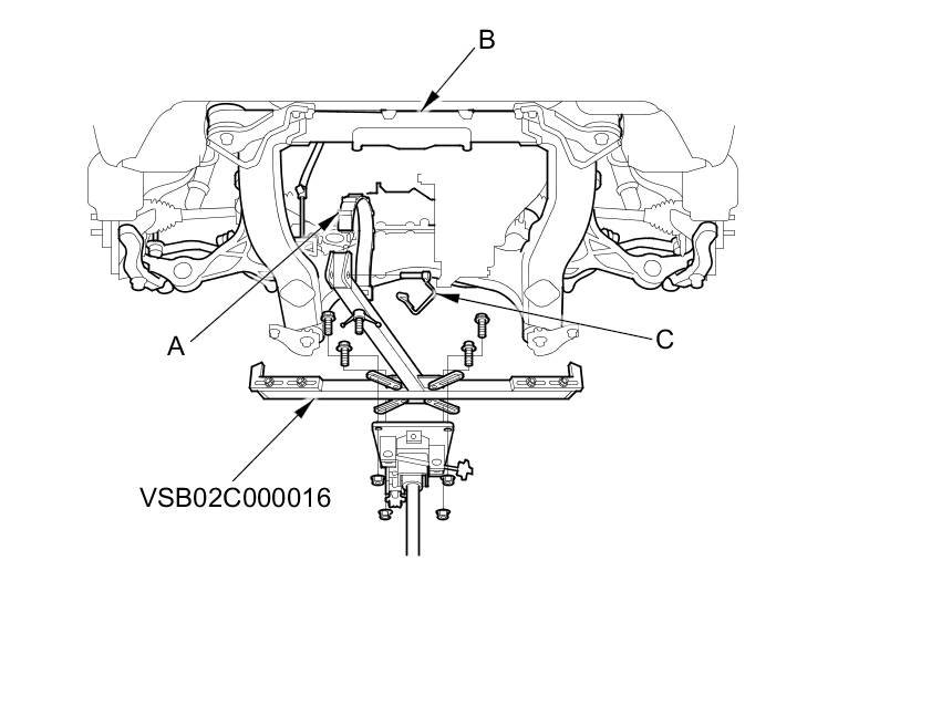 59. Attach the subframe adapter (VSB02C000016) to the front subframe by looping the belt (A) over the front of the front subframe (B), then secure the belt with its stop (C).