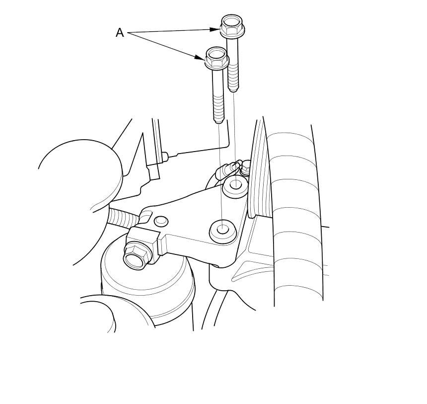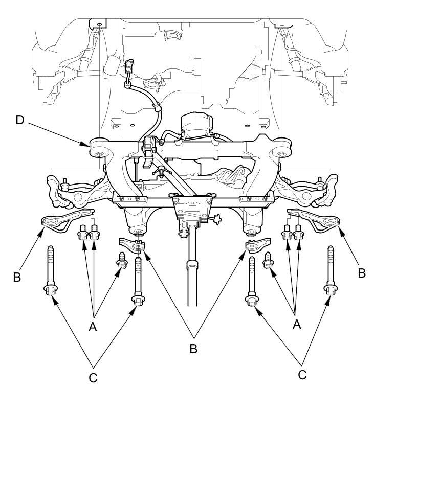 61. Remove the six mounting bolts (A) securing the subframe stiffeners (B), the four subframe mounting bolts (C), and the stiffeners, then lower the front subframe (D).