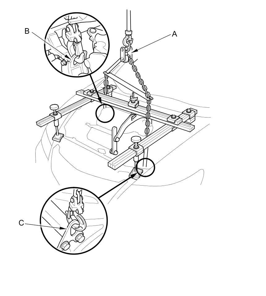 62. Lower the vehicle and attach a chain hoist (A) to the engine hanger (B) and transmission hanger (C). Lift up the engine/transmission until it is securely supported by the chain hoist, and remove the engine support hanger and the engine balance bar, and the engine hanger adapter set.