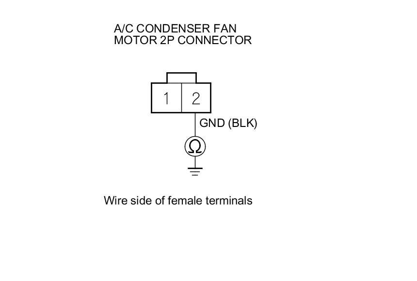 2. Check for continuity between A/C condenser fan motor 2P connector terminal No. 2 and body ground.