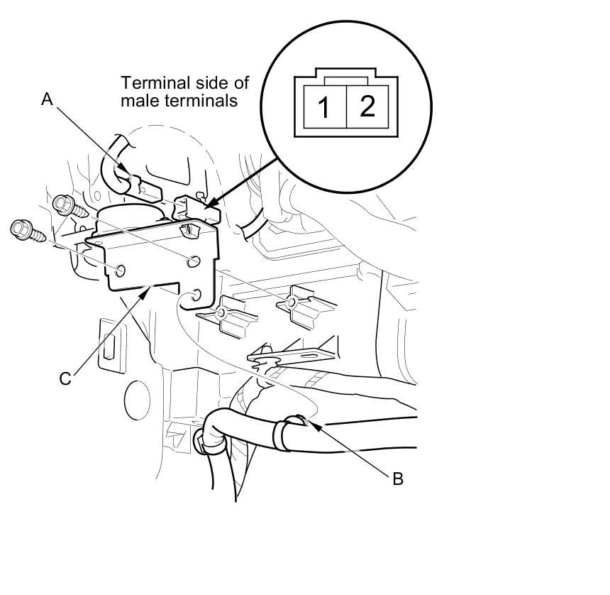 2. Disconnect the 2P connector (A) and harness clip (B) from the rear sensor beeper bracket (C).