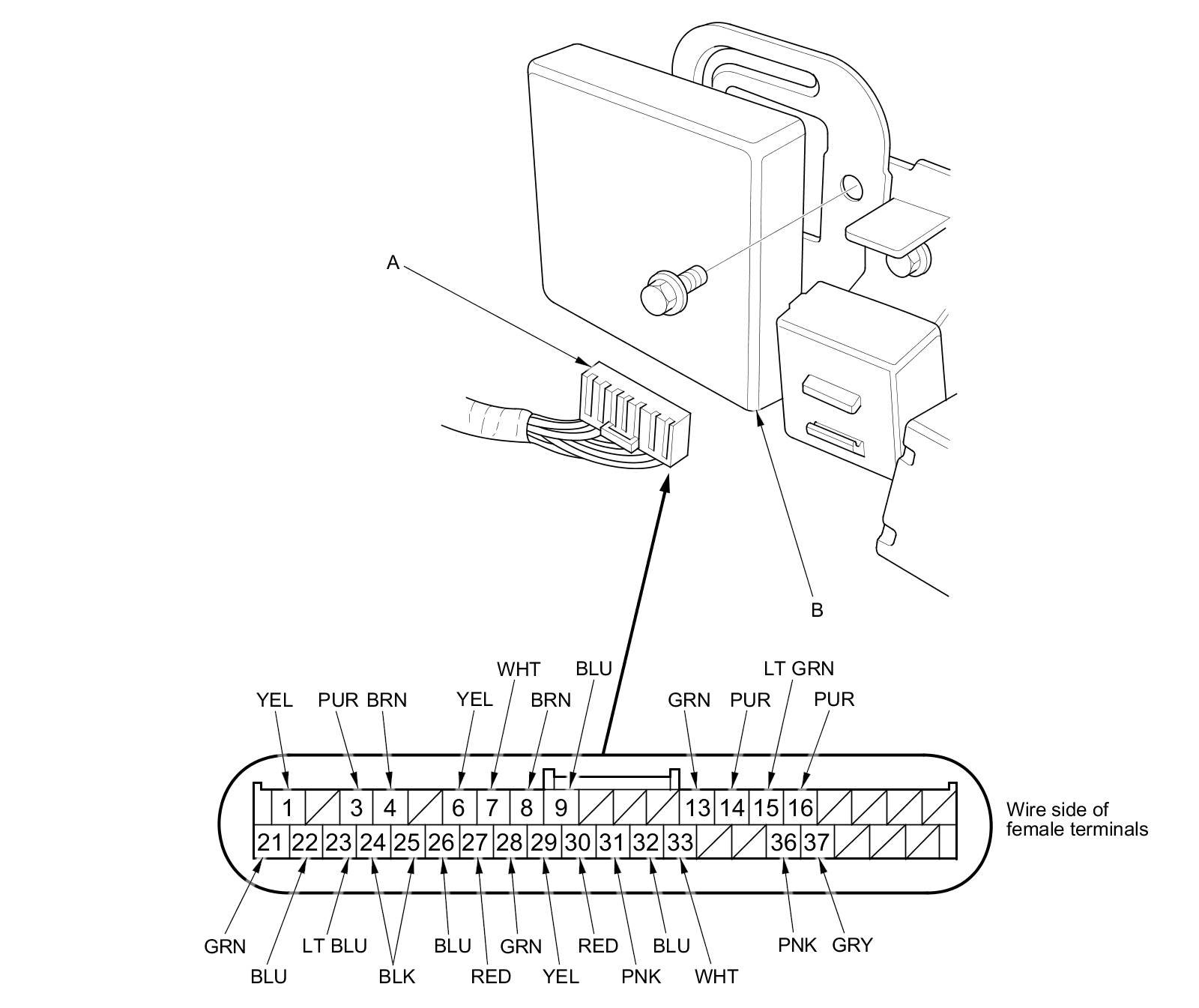 2. Disconnect the 40P connector (A) from the adaptive front lighting control unit (B).