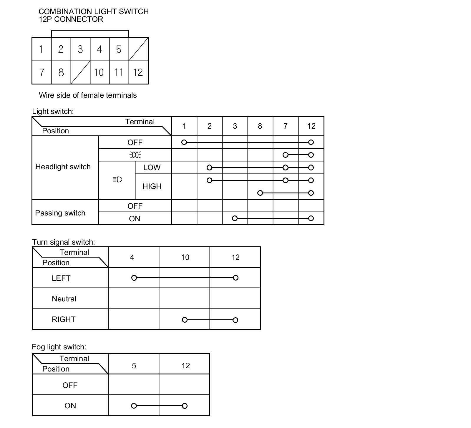 - If the terminals look OK, check for continuity between the terminals in each switch position according to the tables.