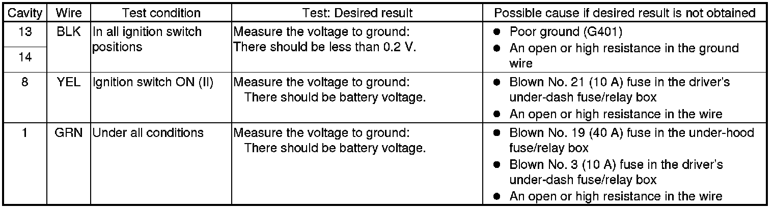 5. Disconnect the 14P connector from the daytime running lights control unit, and do the following input tests.