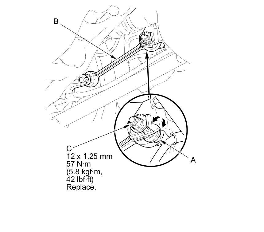 3. Hold the adjusting bolt (A) on the rear control arm (B), and loosen the self-locking nut (C).