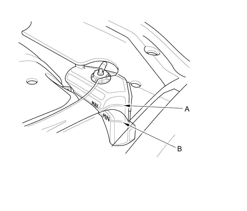 1. Check the coolant level in the coolant reservoir. Make sure it is between the MAX mark (A) and MIN mark (B).