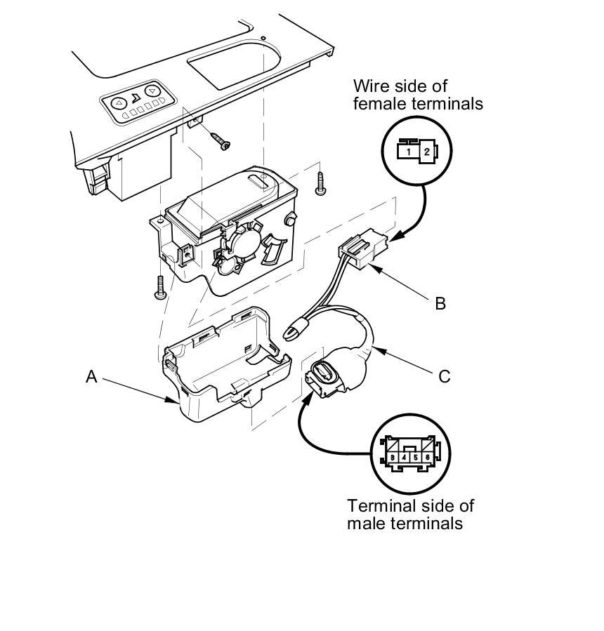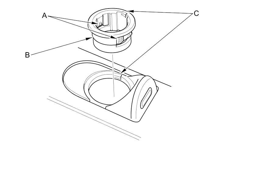 8. Gently depress the tabs (A), then remove the housing (B) from the panel. Note the location of the indexing tabs (C).