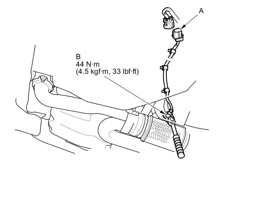 2. Raise the vehicle on a lift, then remove the front secondary HO2S (B).