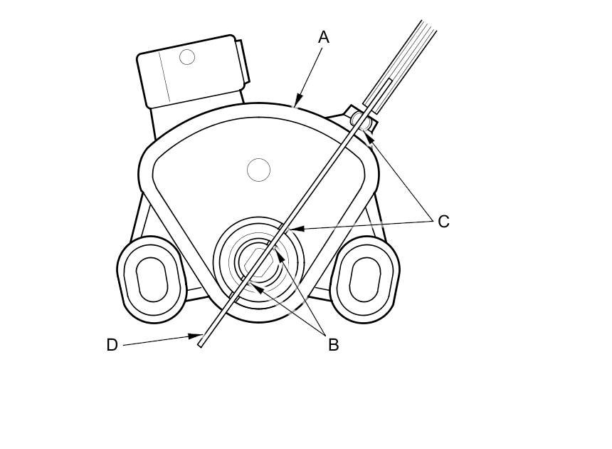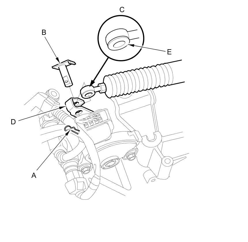 15. Attach the shift cable end to the control lever (C), then insert the control pin (D) into the control lever hole through the shift cable end, and secure the control pin with the spring clip (E).