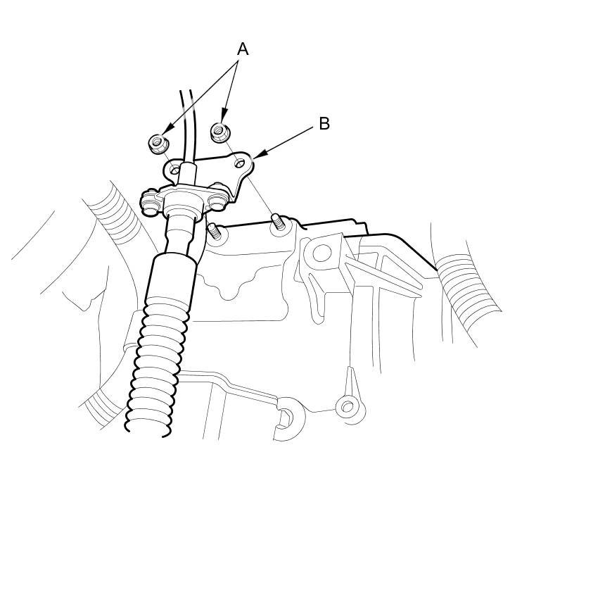 6. Remove the nuts (A) securing the shift cable bracket (B).