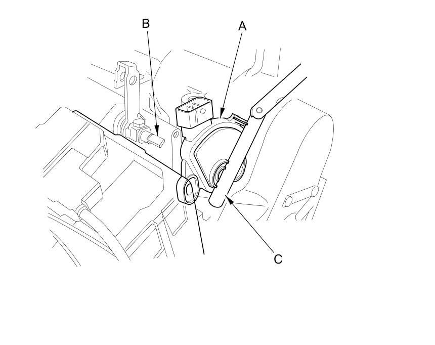 10. Install the transmission range switch (A) gently on the selector control shaft (B) while holding it in the N position with the 2.0 mm (0.08 in) blade (C).
