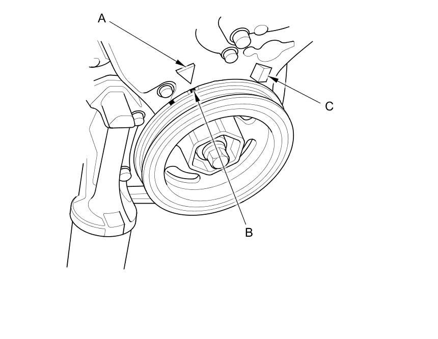 9. Aim the light toward the pointer (A) on the timing belt lower cover and the timing mark (B) on the crankshaft pulley. Check the ignition timing under a no load condition (headlights, blower fan, rear window defogger, and air conditioner are turned off).