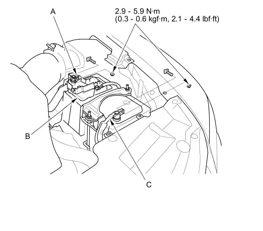 3. Reconnect the positive cable (A) to the battery (B) first, then reconnect the negative cable (C) to the battery.